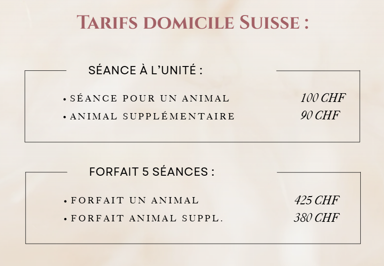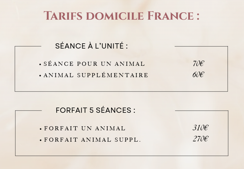 • Les séances de kinésiologie animales se font uniquement à domicile pour le bien-être de vos compagnons.
