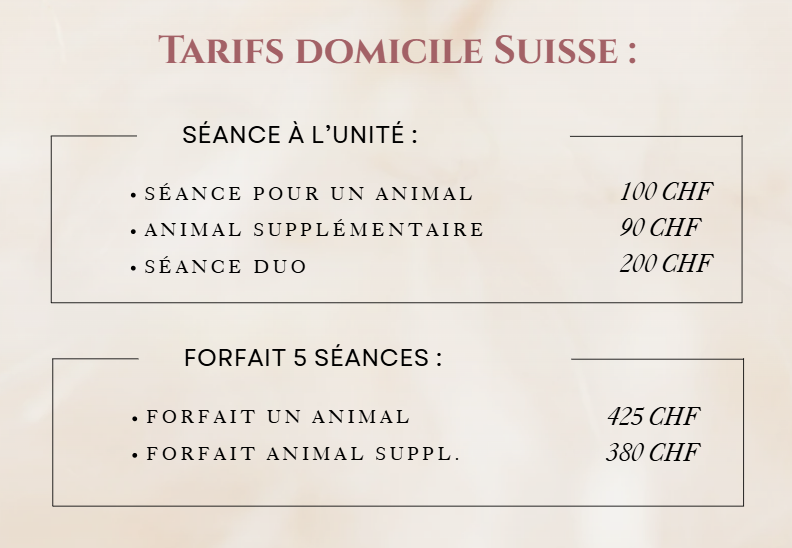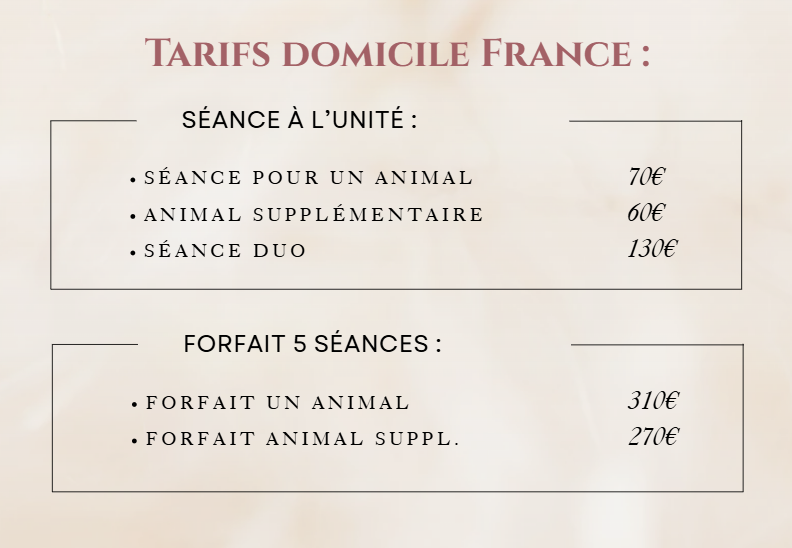 - Les séances de kinésiologie animales se font uniquement à domicile pour le bien-être de vos compagnons.
